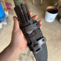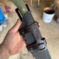 Il fodero è in kydex con passanti in cuoio che ne permettono il porto verticale, orizzontale, diagonale e verticale basso, grazie ad un’appendice facilmente inseribile o rimovibile.